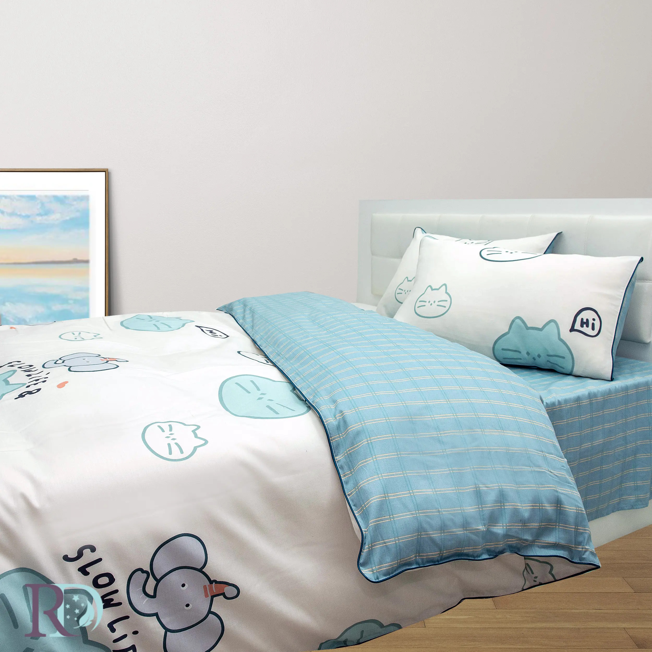 Детски спален комплект с прекрасен десен в светли нюанси внасящ топлина в стаята на всеки малчуган. Материята е хипоалергенна, нежна към детската кожа и дишаща, което осигурява здравословен и спокоен сън. Памучният сатен съчетава мекота, здравина и естествен блясък.