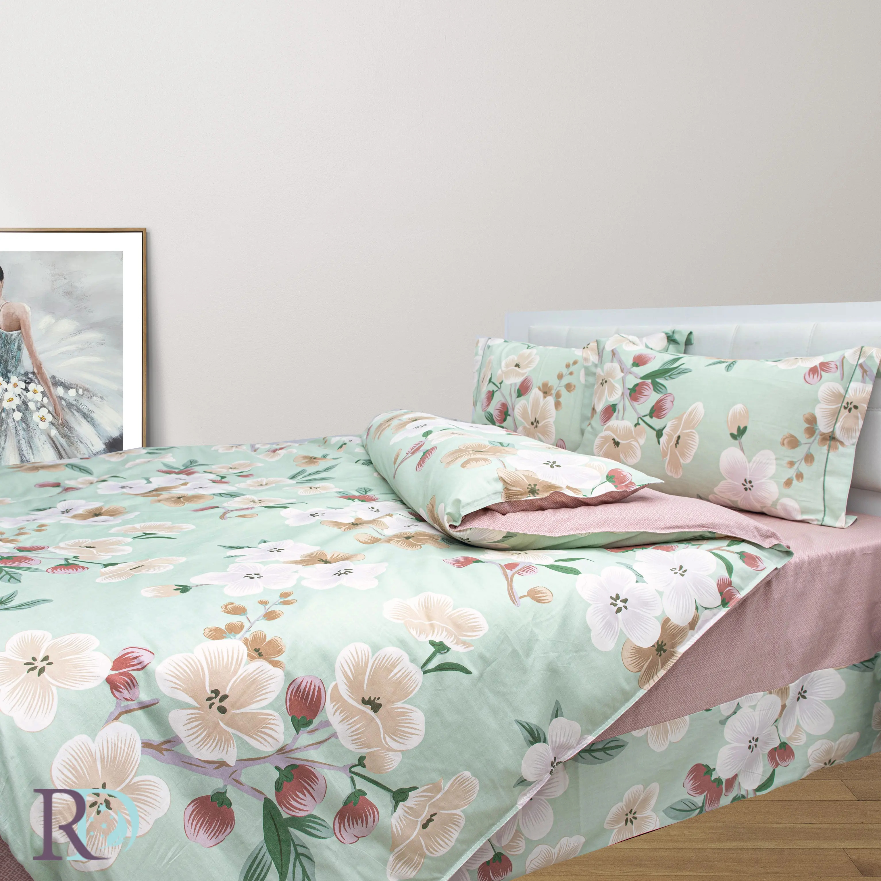 Подарете си свежест, лекота и стил с този спален комплект, чиято основа е в нежен ментов цвят, украсен с красиви флорални мотиви. Изработен от 100% чист, мек и дишащ памук, комплектът гарантира комфорт и приятен допир за пълноценен сън всяка нощ.